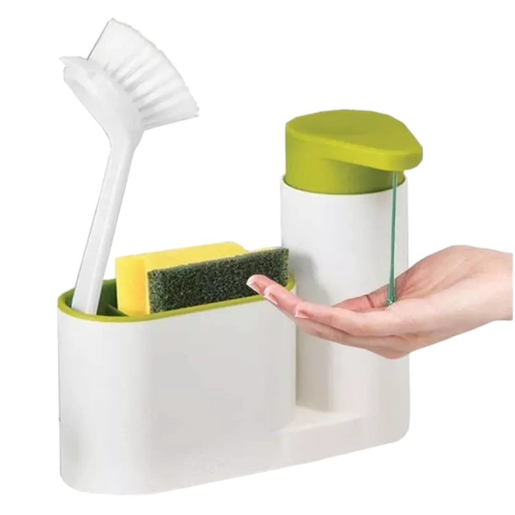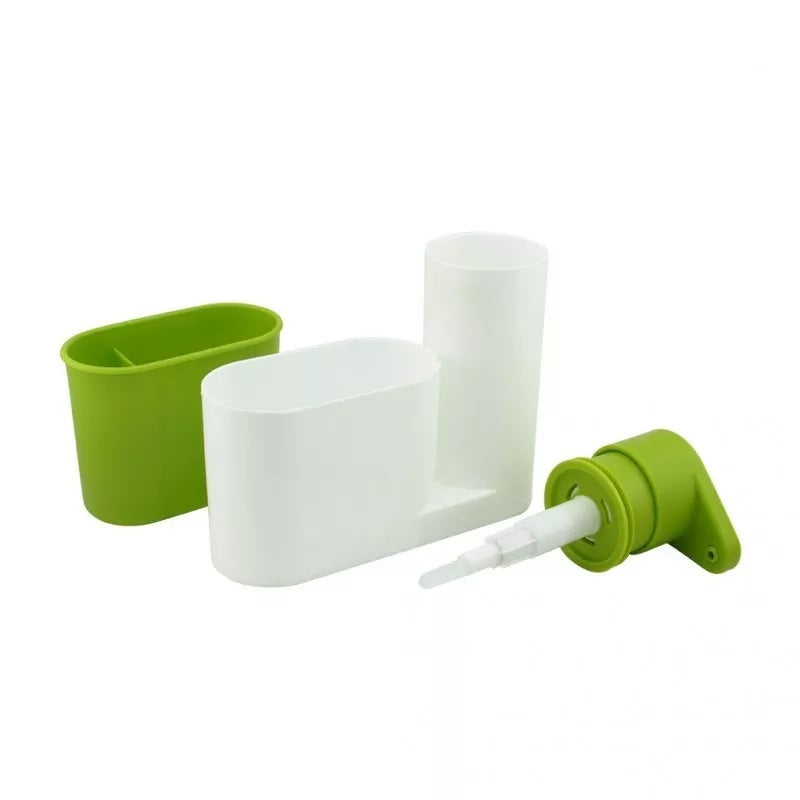 Este organizador es la solución perfecta para mantener tu cocina organizada y libre de residuos. Con su diseño funcional y elegante, podrás almacenar jabón, esponjas y otros utensilios de cocina de manera eficiente, sin perder espacio. Gracias a su bomba de jabón de fácil presión y su soporte para esponjas con orificios de drenaje, tu cocina se mantendrá más limpia, ordenada y libre de bacterias, mientras ahorras tiempo en la limpieza diaria. Este set, fácil de desmontar, facilita su mantenimiento y asegura que todos tus elementos esenciales estén al alcance de la mano, en un solo lugar.
