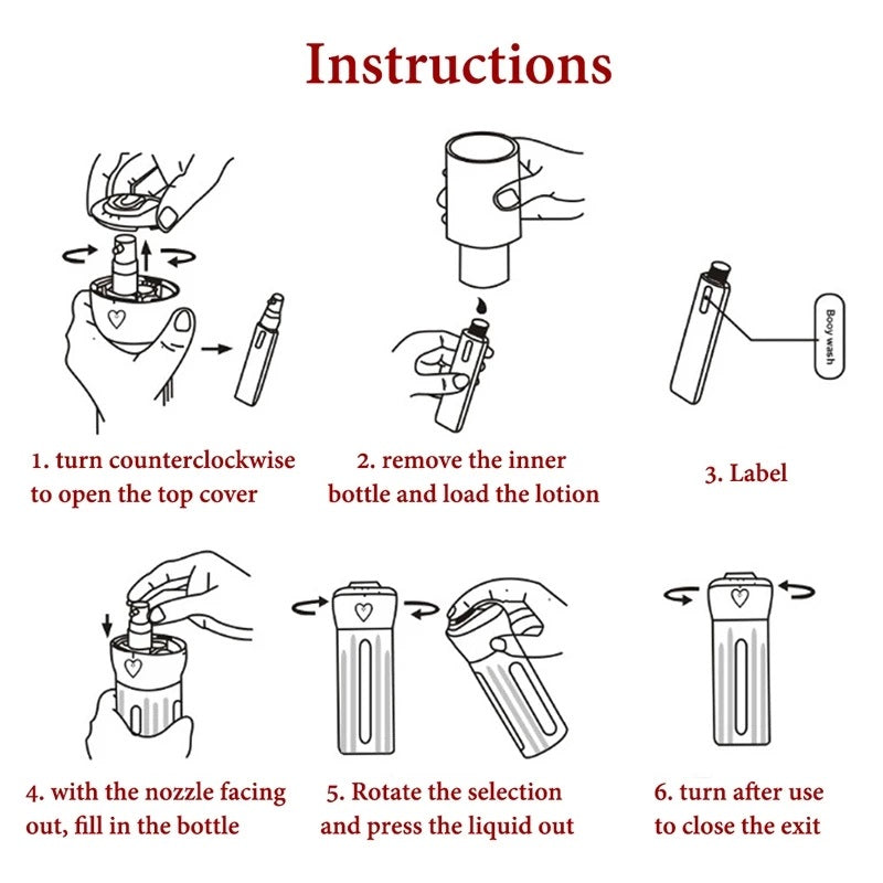 Instrucciones 1. Gire en sentido antihorario para abrir la cubierta superior 2. Retire la botella interior y cargue la loción 3. Con la boquilla hacia afuera, rellene la botella 5. Gire la selección y presione el líquido 6. Gire después del uso para cerrar la salida