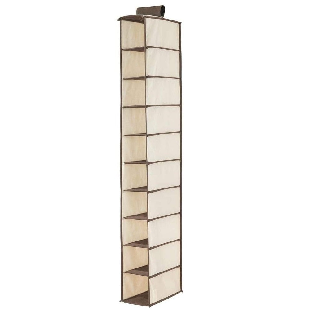 Organice y proteja sus zapatos con estos estantes colgantes para zapatos que ahorran espacio. Estos estantes colgantes para zapatos están diseñados para acomodar hasta 10 pares de zapatos. Los lados transparentes y transpirables mantienen los zapatos con un olor fresco y la elección del par adecuado es muy fácil. Se cuelga fácilmente de un marco de metal resistente con los ganchos provistos en una barra de armario estándar. Se puede usar para más que zapatos, ideal para ropa de niños, accesorios y más. Color Beige.