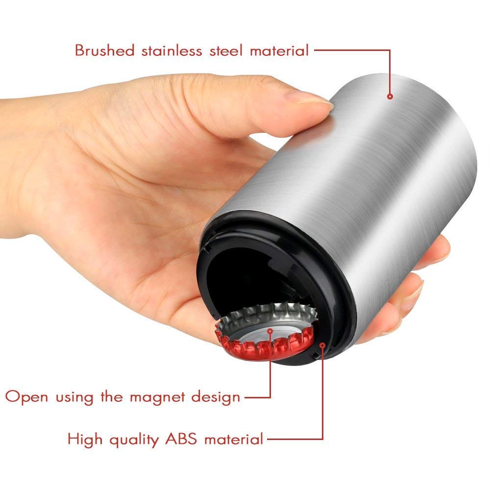 Práctico y rápido destapador de botellas magnético automático en acero inoxidable. Este abridor de botellas automático es el regalo perfecto para un amante de la cerveza, un barman aficionado, un entusiasta de la cerveza artesanal o un coleccionista de tapas de botellas. Elimina fácilmente la tapa de la botella sin abolladuras ni peligros de que las botellas de vidrio se quiebren