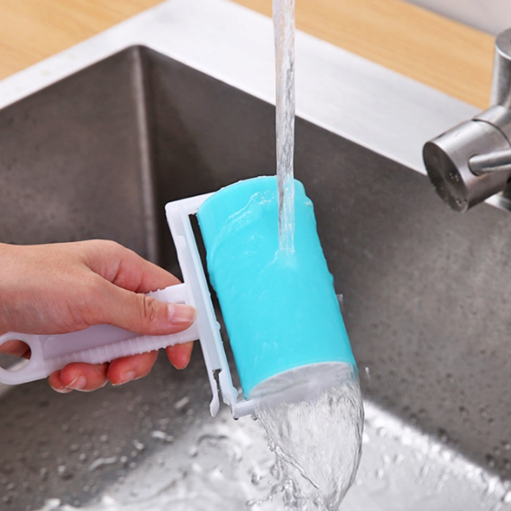 Removedor reutilizable de pelusas, pelos, lanas y suciedades en general en cualquier superficie, incluyendo telas, muebles, cortinas, almohadas, alfombras y suelos.