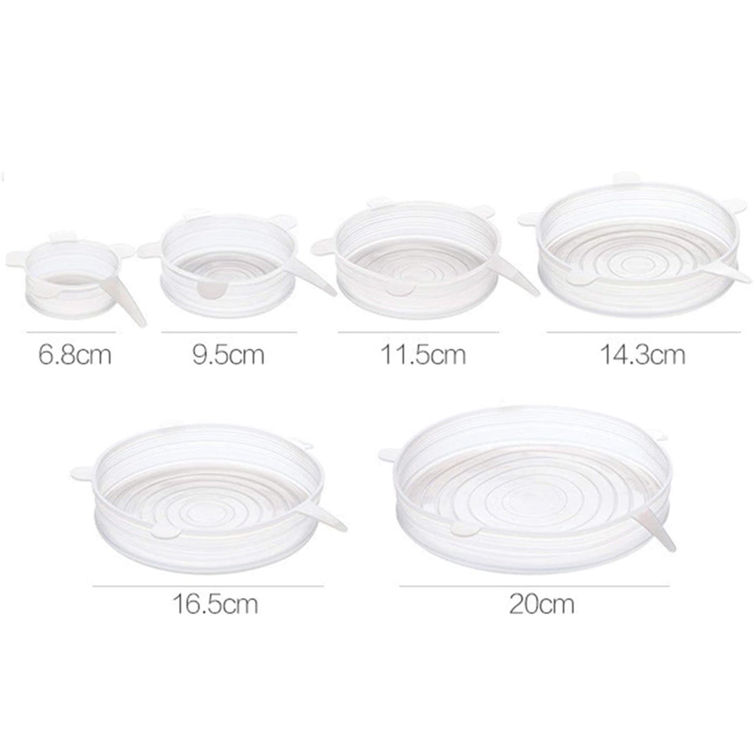 Set x 6 tapas de silicona para guardar alimentos. Tamaños ajustables gracias a su elasticidad.