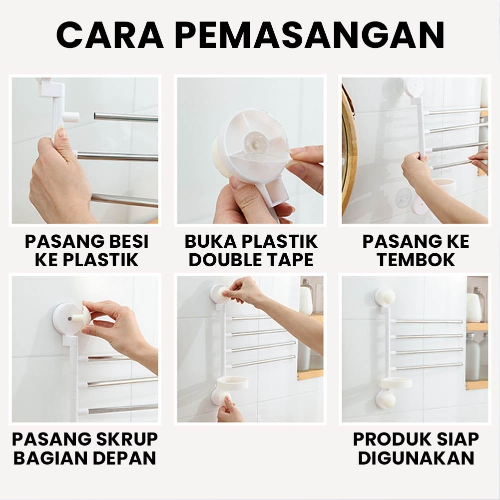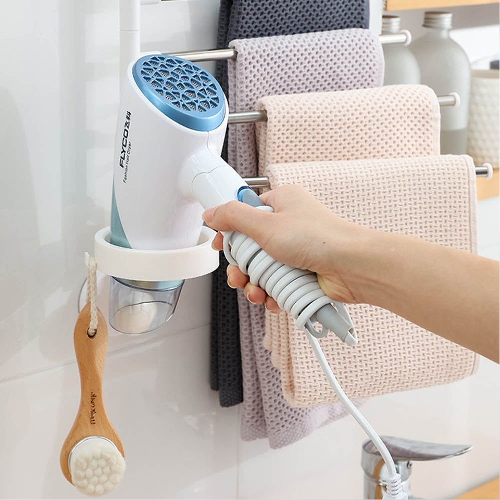 Toallero porta secador minimalista de 4 niveles. La solución perfecta para ordenar tu baño o salón de belleza. Contiene 4 tubos giratorios para toallas u otros implementos + aro para poner el secador. Puedes mover y deslizar cada barra de hierro como desees. La forma de instalar este estante también es fácil, todo lo que tiene que hacer es pegar los adhesivos a una superficie limpia y plana.